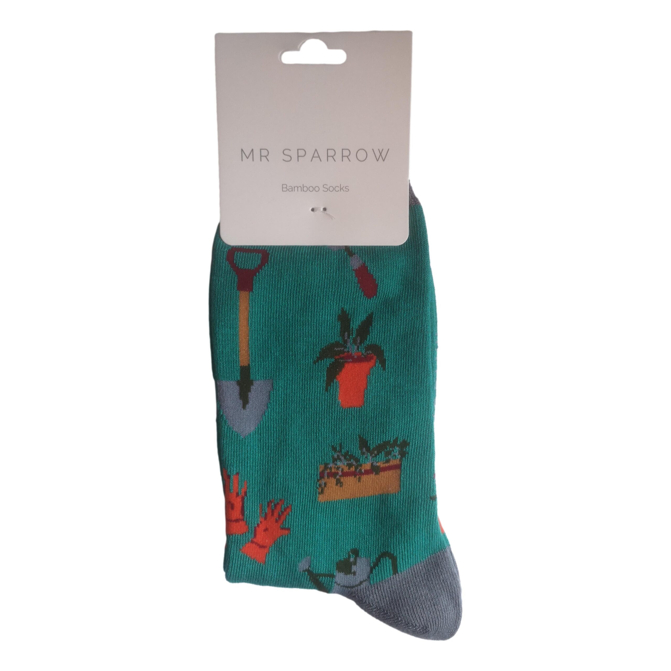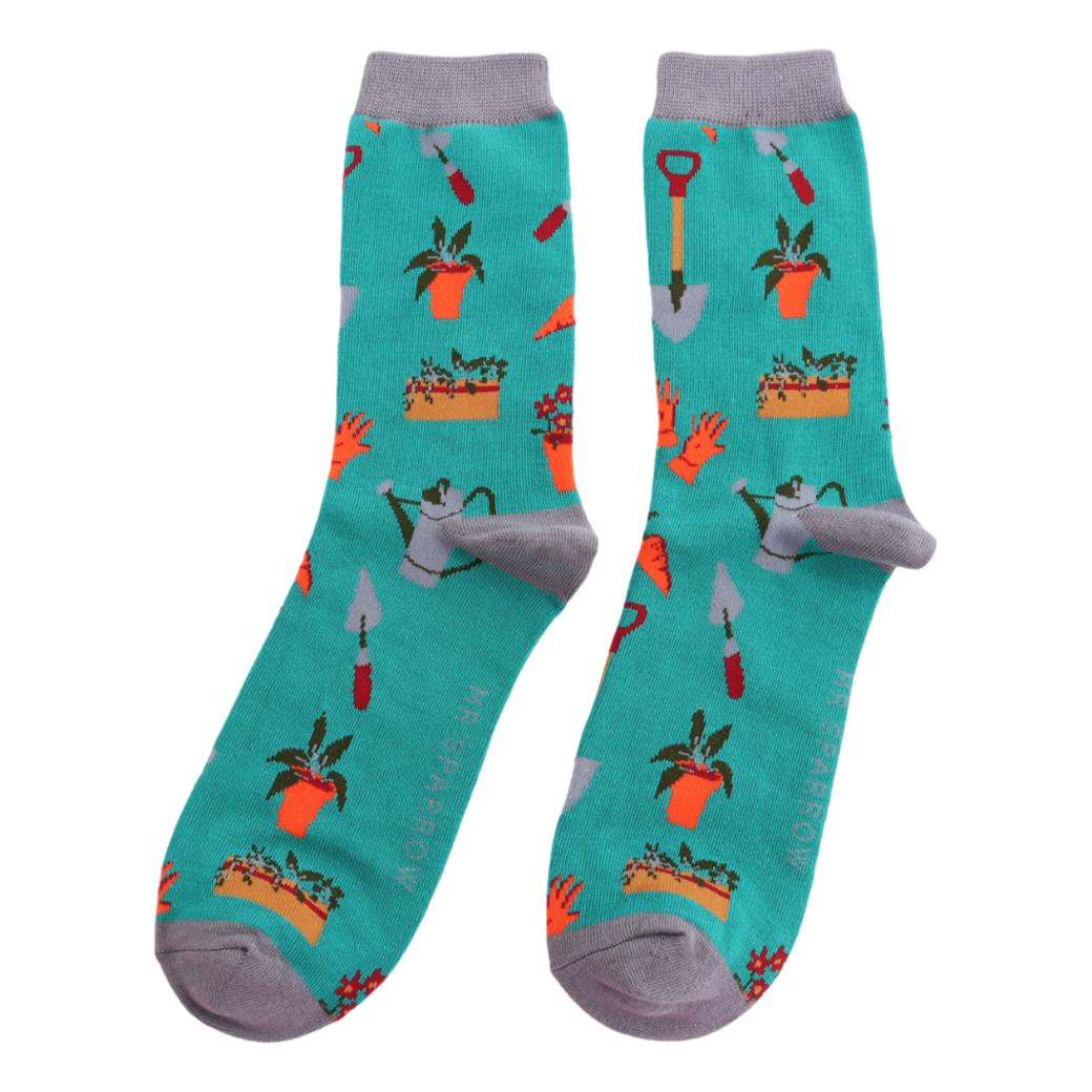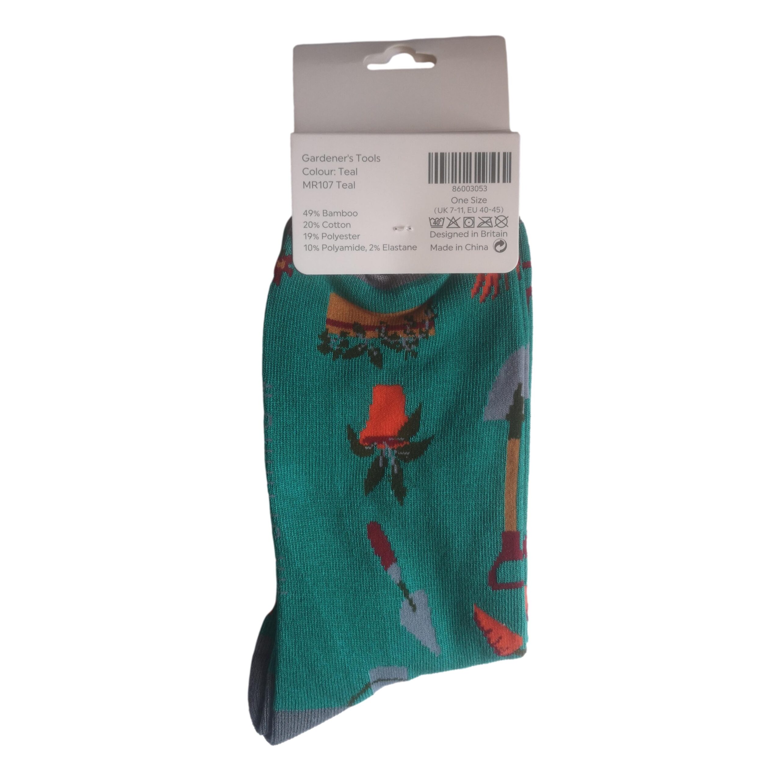 A pair of teal adult mens socks with grey heel, toes and welt; featuring a various Gardening Tools and Plants design