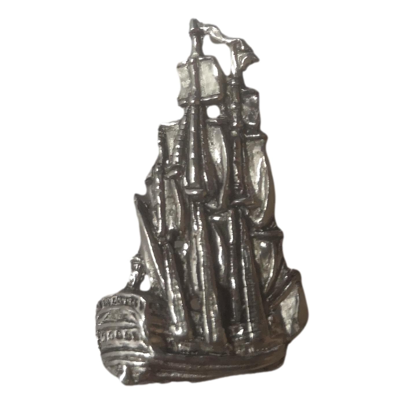 A polished English Pewter lapel pin badge in the shape of the HMS Endeavour Royal Navy research sailing ship, with a double butterfly clip fastener for stability.
