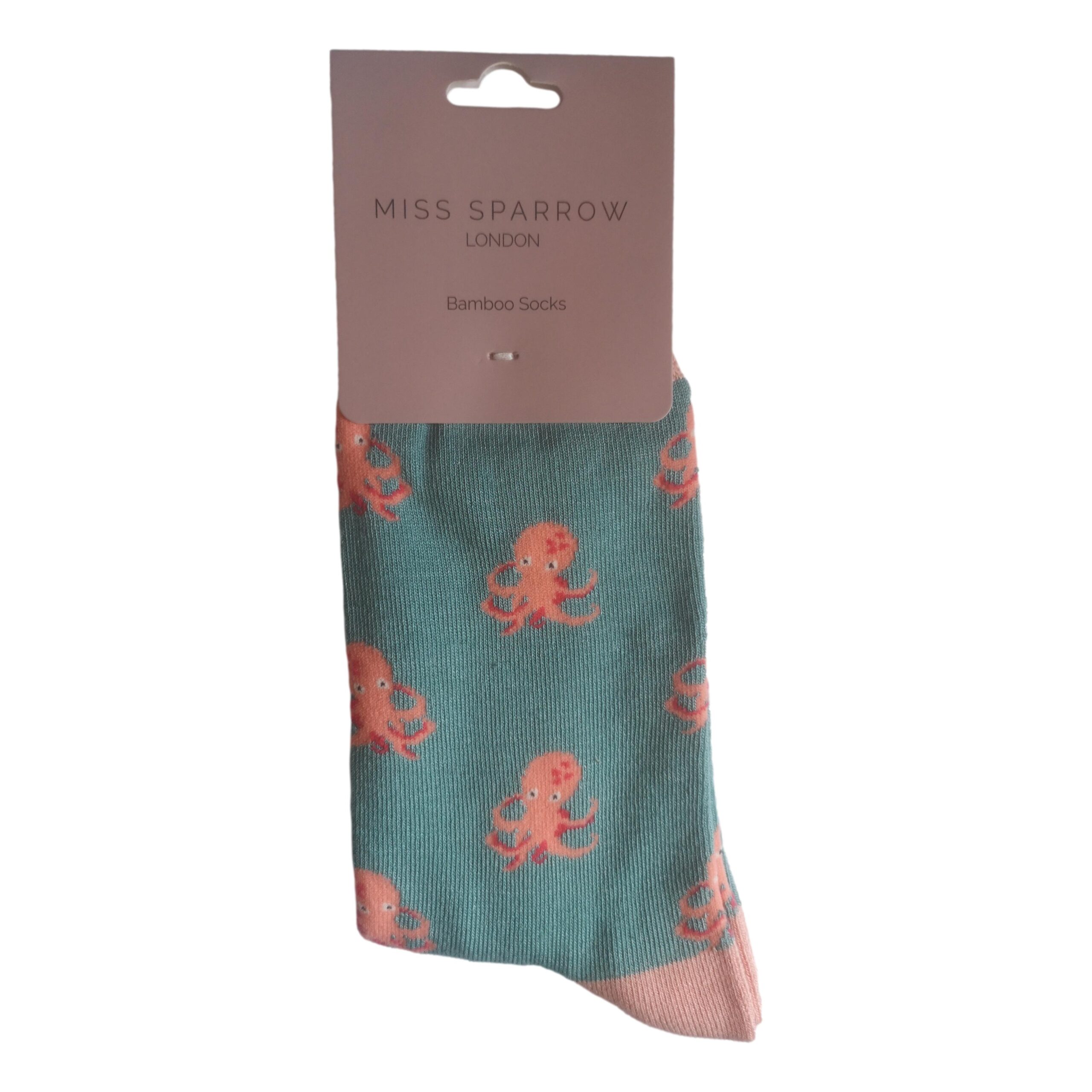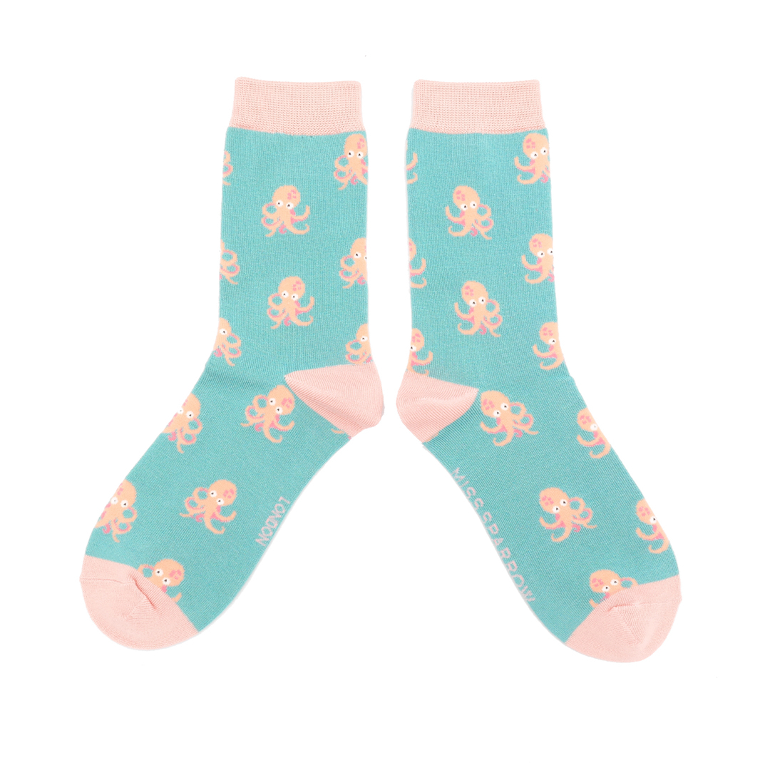 A pair of duck egg adult womens (UK size 3-7) socks with salmon pink heel, toes and welt; featuring a repeating Little Octopus design