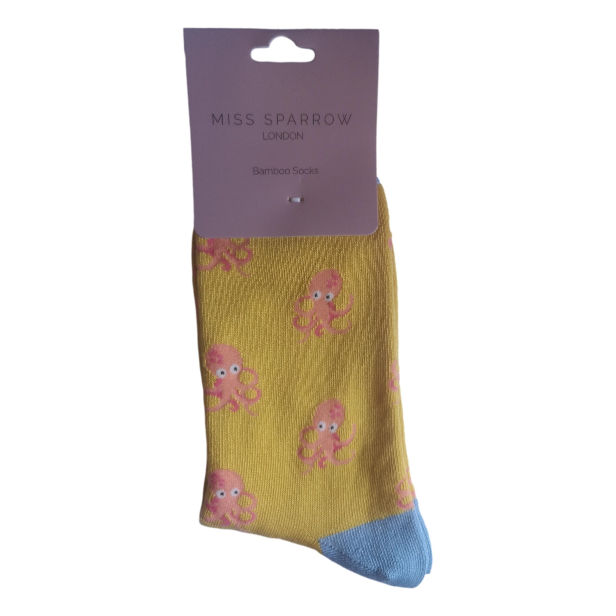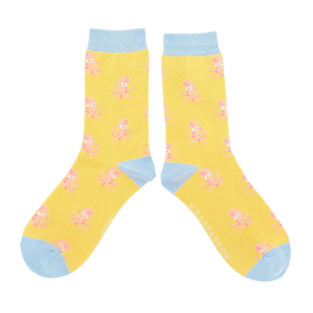 A pair of yellow adult womens (UK size 3-7) socks with pale blue heel, toes and welt; featuring a repeating Little Octopus design