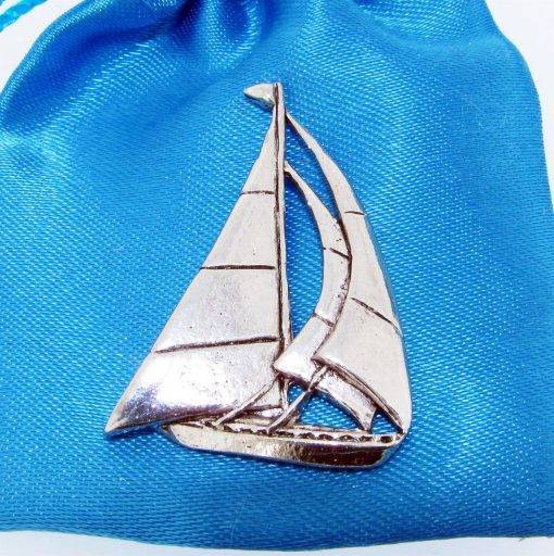 A polished English Pewter lapel pin badge in the shape of a Sailing Yacht, with a double butterfly clip fastener for stability.