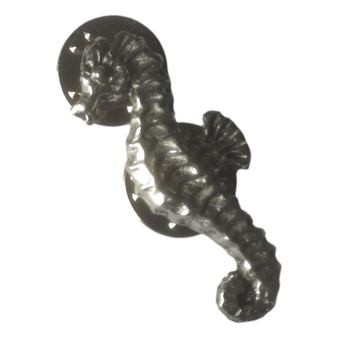 A polished English Pewter lapel pin badge in the shape of a Seahorse, with a double butterfly clip fastener for stability.