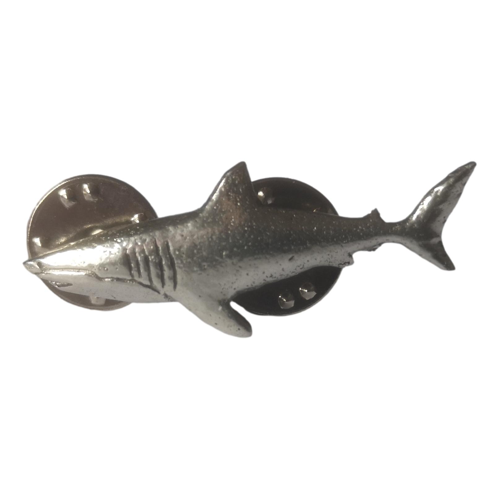 A polished English Pewter lapel pin badge in the shape of a Shark, with a double butterfly clip fastener for stability.