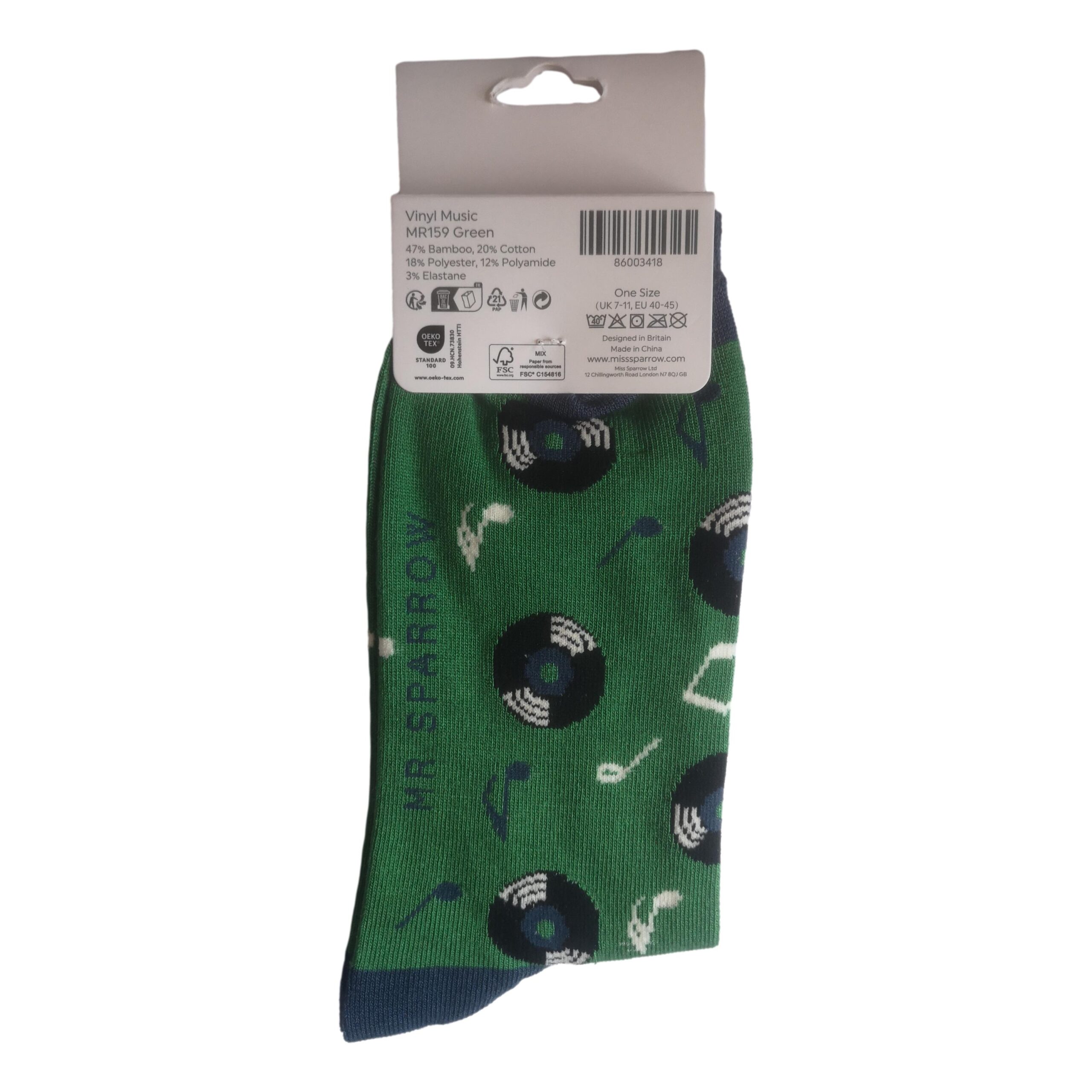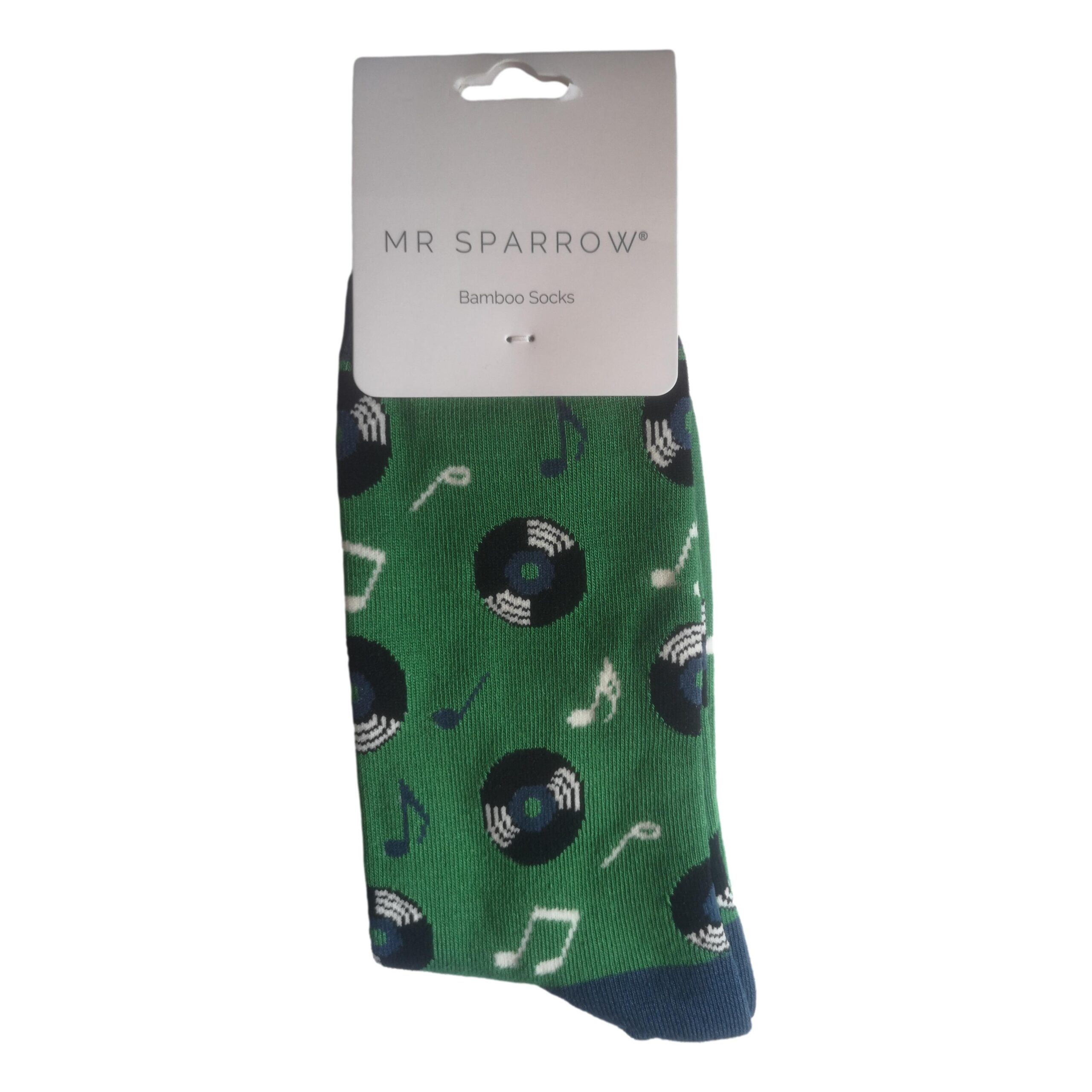 A pair of green adult mens socks with navy heel, toes and welt; featuring a repeating Vinyl Records and Music Notes design